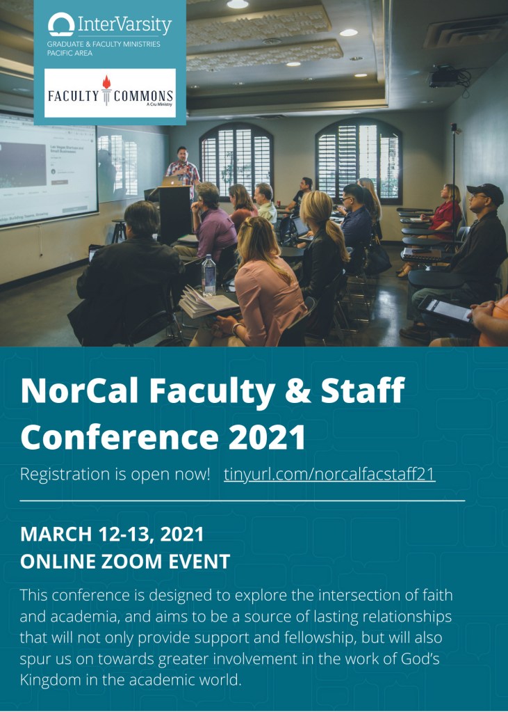 Please join us Friday evening March 12th and Saturday morning March 13th for the Northern California Christian Faculty and Staff Conference, co-sponsored by InterVarsity and Faculty Commons! We welcome participants throughout the Western states and Hawai’i to join us, so please invite your colleagues who are outside of Northern California. This conference is hosted by GFM Pacific, Cru’s Faculty Commons, and IV Pacific Region. Click below for details.