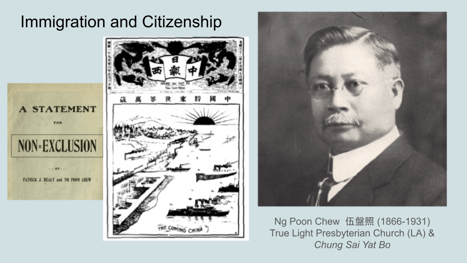 Between 1882 and 1934, Chinese and other Asian laborers were not permitted to migrate or naturalize. Exclusionary Immigration and Alien Land Laws were established on the basis of ethnicity, race, and class even though many of them did not explicitly mention race or ethnicity. Christian leaders like Ng Poon Chew 伍盤照 (1866-1931) attempted to sway public opinion away from the dominant anti-immigration nativism. Ng came to the U.S. before the 1882 Chinese exclusion act, converted to Christianity, and then received a call to ministry. He went to San Francisco Theological Seminary and pastored the Chinese Presbyterian Mission in Los Angeles (now True Light Presbyterian Church). He felt called to journalism and left the church to publish the influential Christian newspaper, the Chung Sai Yat Bao. Ng also went on lecture circuits and wrote extensively. His mission was to educate Americans about the Chinese, protest Chinese exclusion, and support revolutionary democracy in China. He was also known as the the Chinese Mark Twain