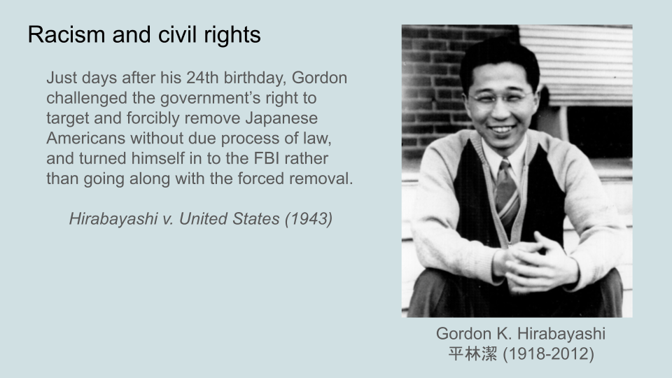 “Just days after his 24th birthday, Gordon challenged the government’s right to target and forcibly remove Japanese Americans without due process of law, and turned himself in to the FBI rather than going along with the forced removal.” Hirabayashi’s challenge was motivated by a desire to challenge the legality of the internment camps. This led to Hirabayashi v. United States (1943) case. The Supreme Court ruled against him and sent him to prison to serve 90 days. He also refused induction into the military as a conscientious objector and was imprisoned again.