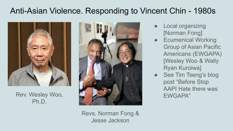 Finally, when Vincent Chin was murdered in 1982, and the judge in his case allowed the accused murderers to go free, a new wave of Asian American activism was unleashed. Asian American Protestant leaders worked at building coalition with activists and attempted to mobilize the Protestant churches to speak out against anti-Asian racism and anti-Asian violence. Among the most notable leaders were Rev. Dr. Wesley Woo, Rev. Wally Ryan Kuroiwa, and Rev. Norman Fong (see my blog “Before Stop-AAPI hate, there was EWGAPA“). Woo was a national executive in the Presbyterian Church, USA national office in the mid-1980s. He had experience as a pastor with community organizing training and was a historian. During the movement for Vincent Chin, he and Wally Kuroiwa mobilized Asian American leaders from other Protestant denominations to form the Ecumenical Working Group of Asian Pacific Americans (EWGAPA) to monitor instances of anti-Asian violence and to persuade their denominations to issue statements and resolutions against anti-Asian violence. EWGAPA also collaborated with Asian American activists. Woo’s office helped fund René Tajima’s documentary “Who Killed Vincent Chin” (Tajima’s relatives are pastors and church leaders at Altaden Presbyterian Church). As for Rev. Norman Fong, a long time youth and young adult pastor with a passion for SF Chinatown’s social problems, the Vincent Chin case inspired him to mobilize the local Asian American Christian community in the S.F. Bay Area. He befriended the Rev. Jesse Jackson, who was the first public national figure to speak out for Vincent Chin. During his presidential campaign, Jackson came to Cameron House to speak in support of Lily Chin’s drive for justice for her son.